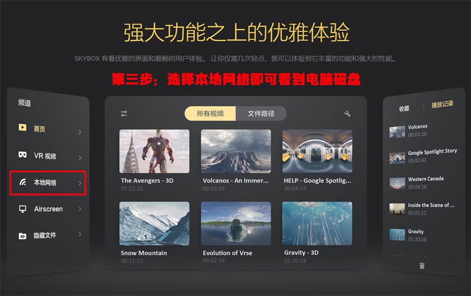 其次,打开VR中的skybox,找到左边选项中的本地网络,只要电脑塔建局域网成功,就可以看到电脑中的共享磁盘,你只需将下载好的3D电影放到共享的磁盘,就可以在VR中观看啦,是不是很简单!