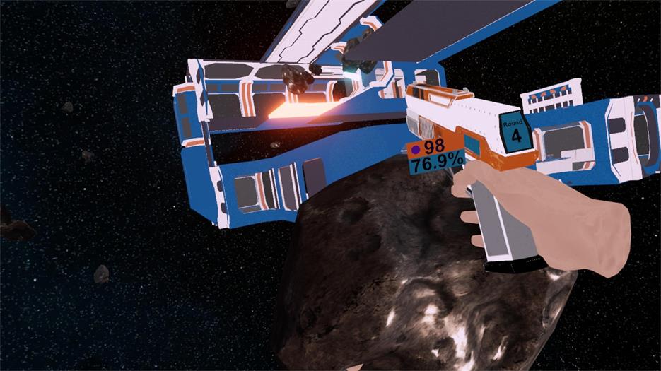 用你的手枪射击小行星,尽可能多地保持空间站完好无损。 在你的枪的左侧,有一个剩余空间站百分比的读数。 如果它达到 0% – 游戏结束。